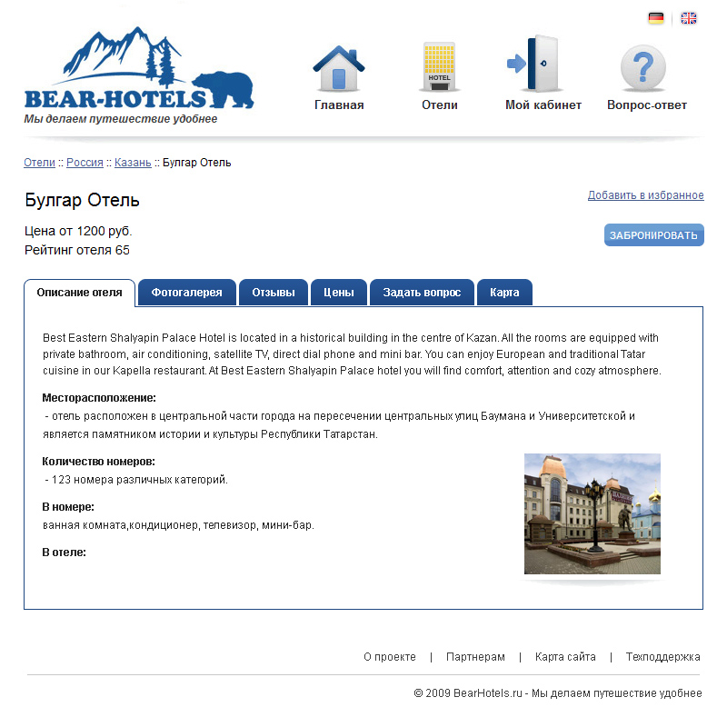 Проект bear-hotels.ru разработан как удобная система по поиску и бронированию номеров в отелях. Пользователь может узнать всё об интересующем его отеле, не выходя из дома: почитать отзывы, выбрать комнату, оплатить бронирование. Портал планирует объединить в одну систему все отели России.