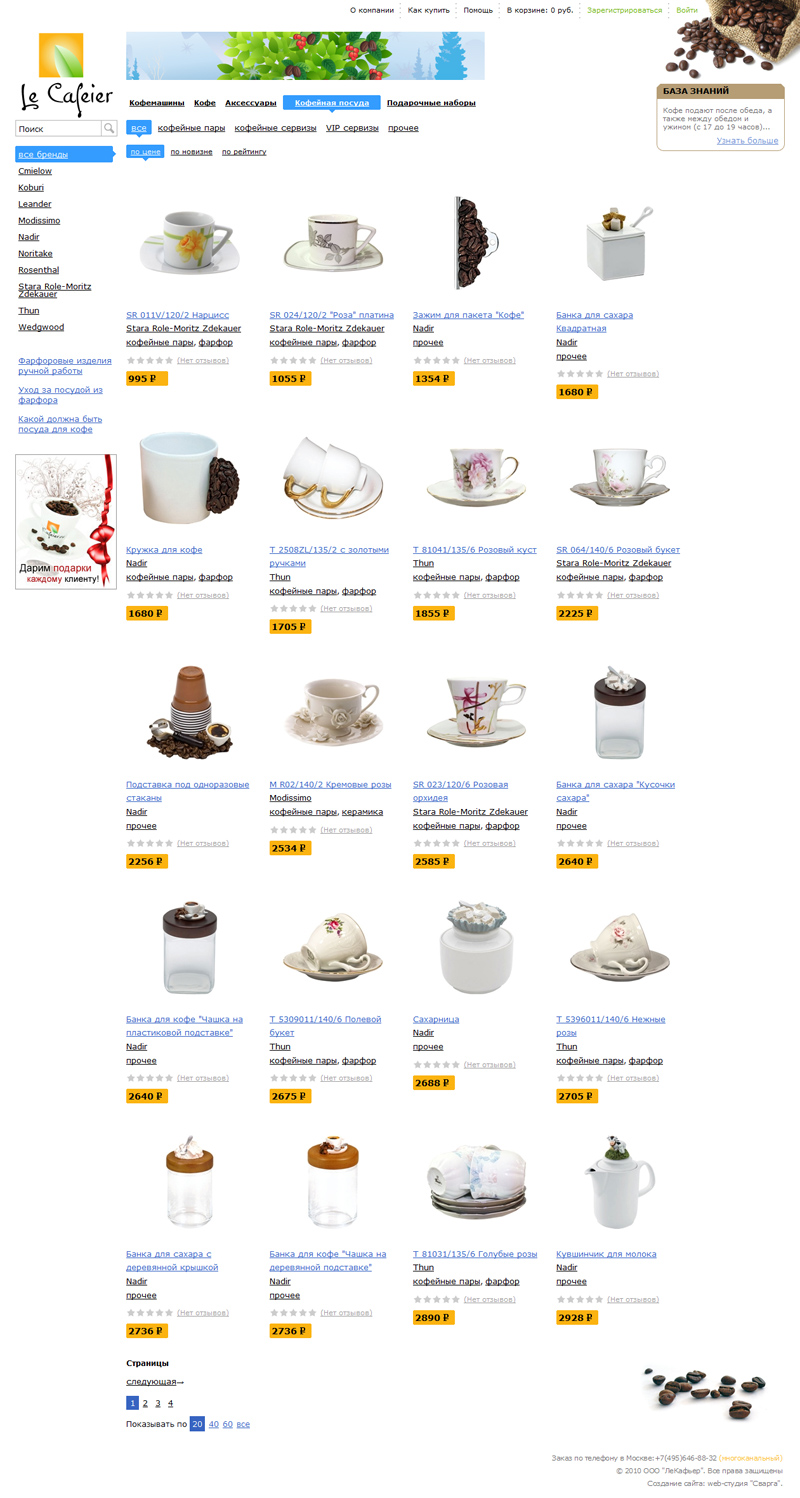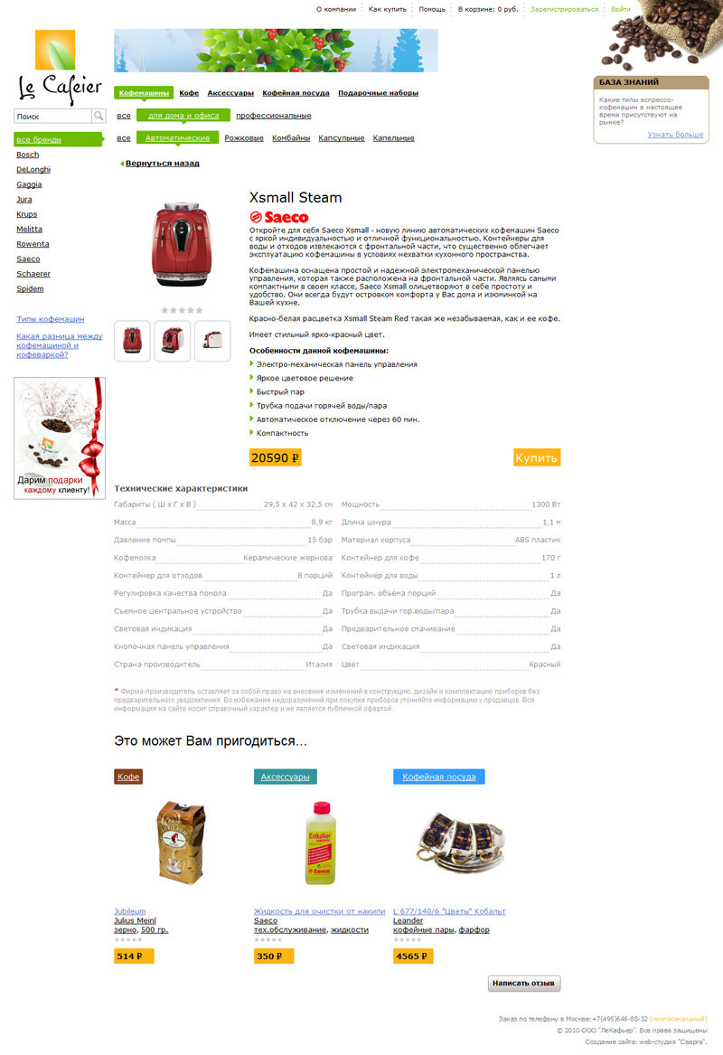 - каталог товаров, разделенный на 5 подкаталогов (кофемашины, кофе, аксессуары, кофейная посуда и подарочные наборы), причем каждый раздел имеет свою, легко изменяемую через админку, цветовую гамму;