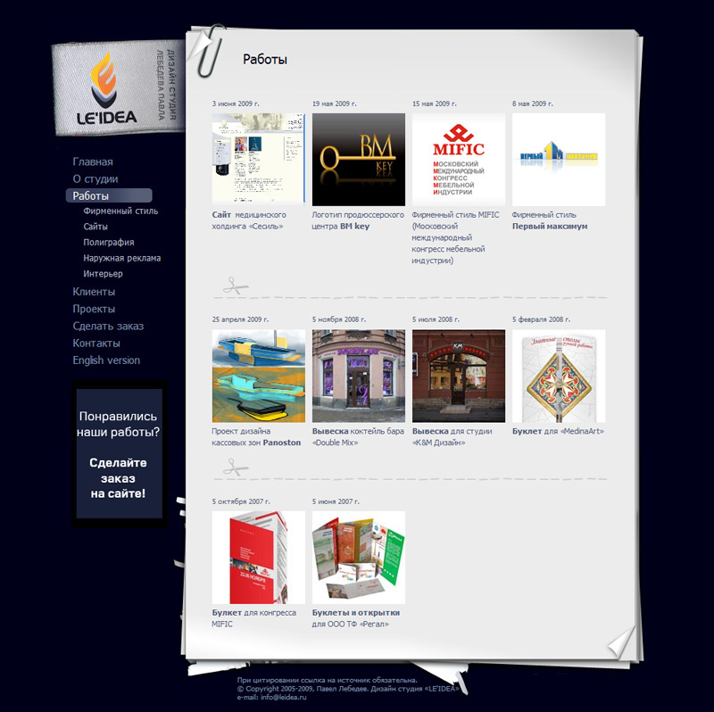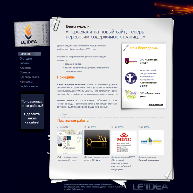 Более 7 лет студия дизайна Лe Идeя делает сайты, фирменные стили, логотипы и рекламные кампании. Основатель и руководитель студии LЕ'IDЕА — Лeбeдeв Пaвeл. Он имеет богатейший опыт работы в рекламной отрасли, полученный за время работы, практики и зарубежных стажировок.