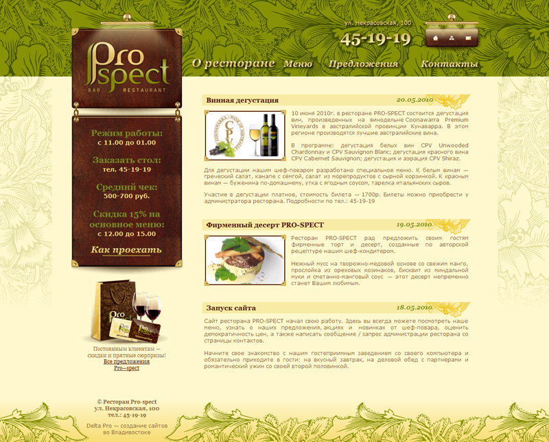 Pro-Spect (г.Владивосток) - это потрясающие ресторан европейской кухни. Уютный зал на 40 персон идеален как для деловых обедов, так и для семейных ужинов, банкетов и корпоративных торжеств.