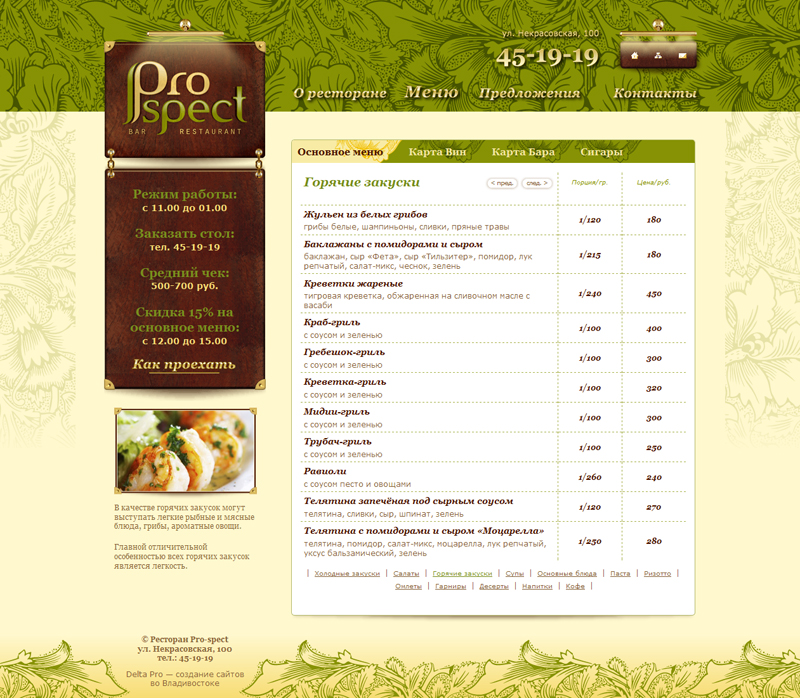 Задача сайта: погрузить посетителей в очаровательную обстановку ресторана, заинтересовать акциями и событиями, и окончательно покорить блюдами в меню. А замечательный дизайн от Ханны Томиловой никого не оставит равнодушным.