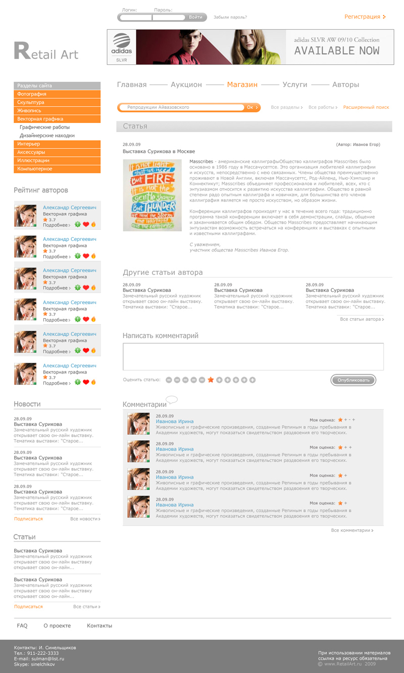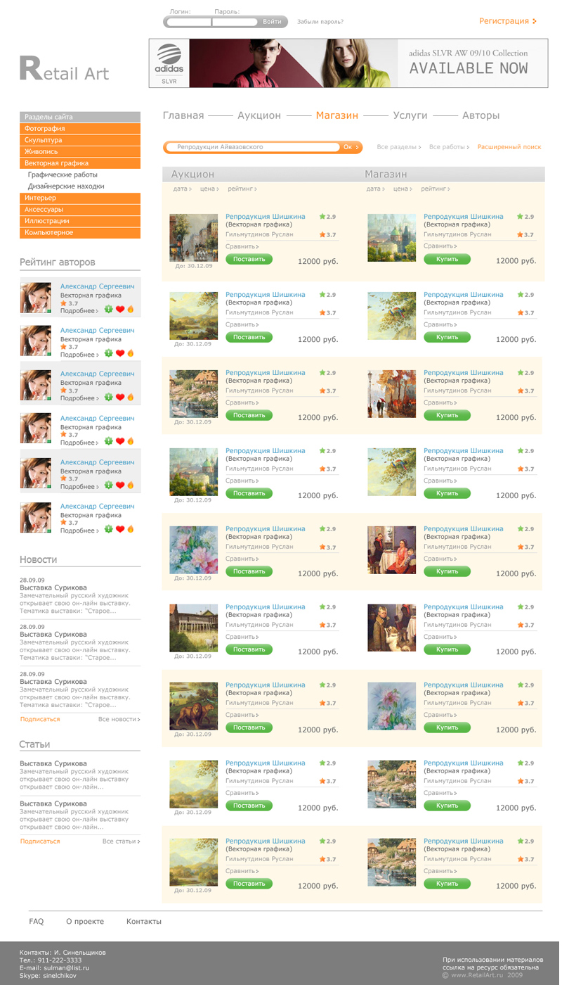 2. Дизайнером решено множество нестандартных задач, результатом чего стал уникальный интерфейс, который удобен пользователям, но акцентирует их внимание на продаваемых работах, а не на функциях сайта.