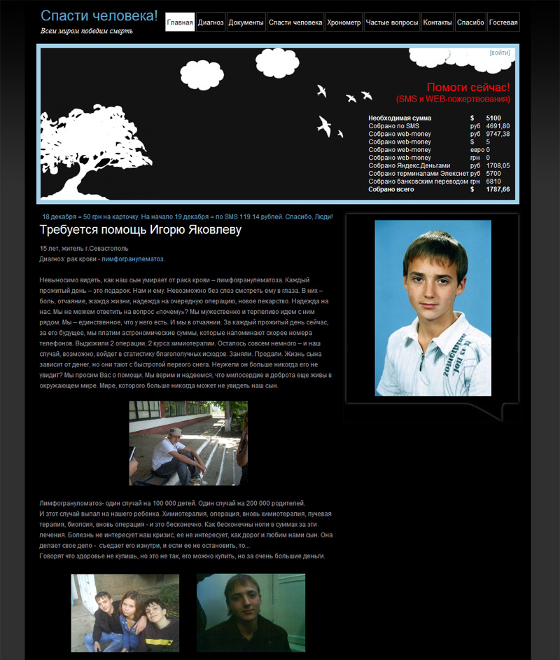 Некоммерческий проект web-студии "Сварга" в помощь Игорю Яковлеву (15 лет, г. Севастополь). Диагноз: рак крови – лимфогранулематоз.