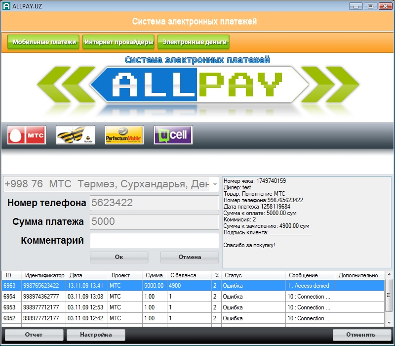 Программа для проведения платежей на мобильные телефоны, а также платежей за интернет и коммунальные услуги в Узбекистане.