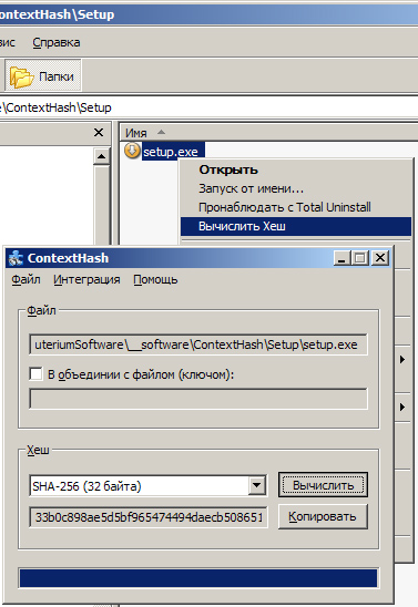Windows приложение, встраивающееся в контекстное меню windows и позволяющее вычислять для файлов контрольные суммы (хеши) md5, sha-1, sha-256, а также проверять целостность переданных файлов, сравнивая сигнатуры.