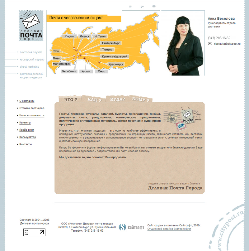 ООО "Компания Деловая почта города" – крупнейшая на Урале служба курьерской и почтовой доставки. Компания основана в Екатеринбурге в 2001 году и специализируется на предоставлении качественных деловых услуг в сфере b-2-b (business-to-business).