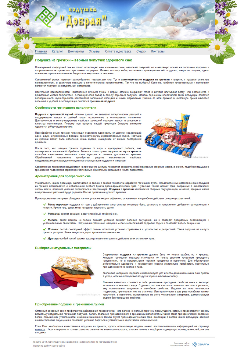 обновили сайт "Подушка "Добрая", на котором представлен каталог ортопедических изделий с наполнителем из гречишной лузги: матрасы, подушки, массажные изделия. На сайте можно ознакомиться с преимуществами продукции, прочитать отзывы покупателей, узнать условия доставки и оплаты, а также сделать заказ.
