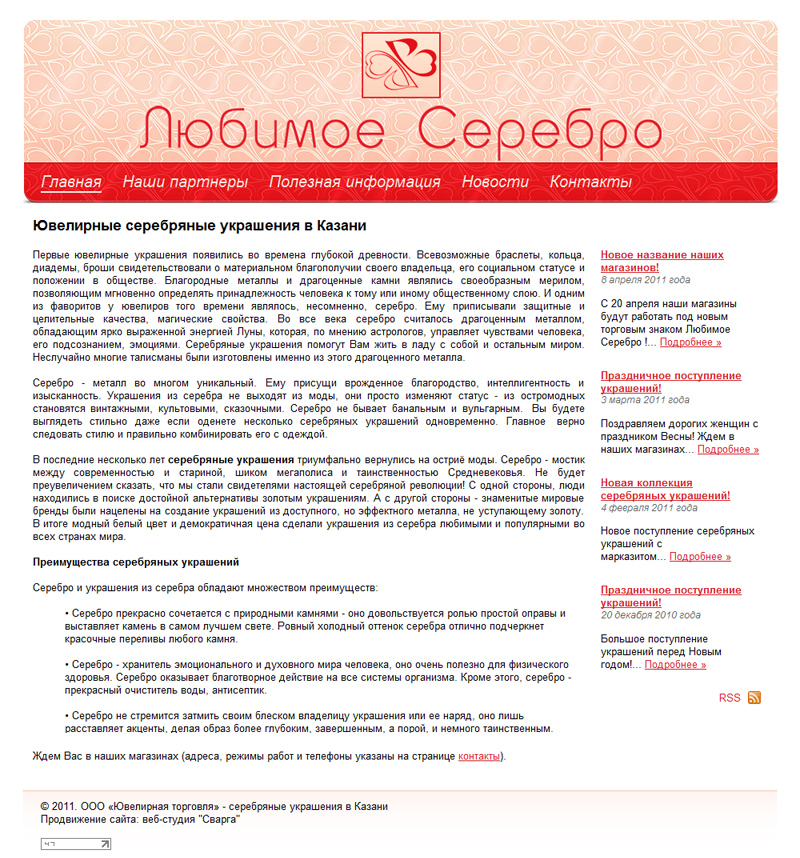 Компания ООО "Ювелирная торговля" работает на ювелирном рынке с 2002 года, является членом Ассоциации "Гильдия Ювелиров России". С 2008 года компания развивает сеть магазинов "Любимое серебро" (ранее - "Серебряный мир") и специализируется на продаже изделий из серебра. Нужна была разработка сайта недорого, после чего требовалось качественное продвижение по целевым запросам.