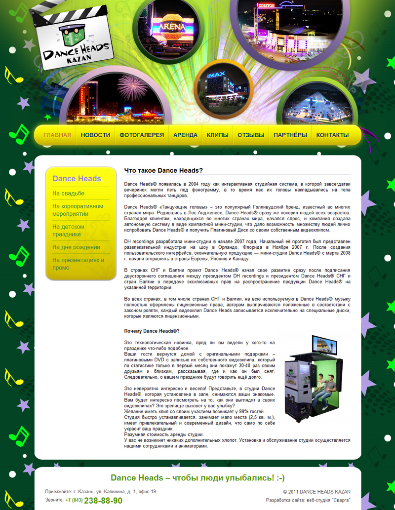 Dance Heads® «Танцующие головы» – это популярный Голливудский бренд, известный во многих странах мира. Это компактная видеозаписывающая студия, в которой можно записать видеоклип с собственным участием! Мобильные студии Dance Heads® просто незаменимы на любом празднике, будь то свадьба, день рождения или кооператив.