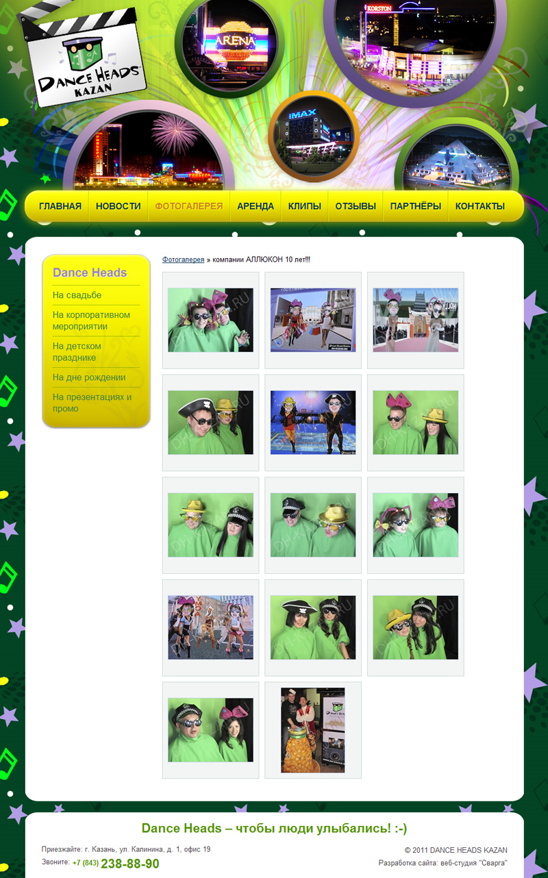 Задача сайта: создать представительство Dance Heads® в Казани, показать клипы и фотографии, сообщить о предстоящих мероприятиях и создать форму онлайн-заявки на аренду студии.