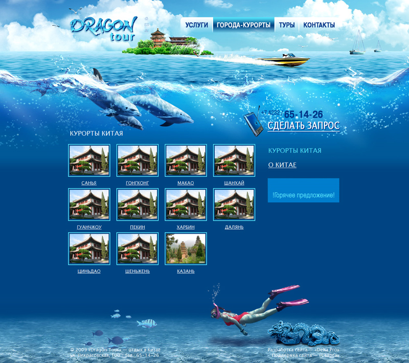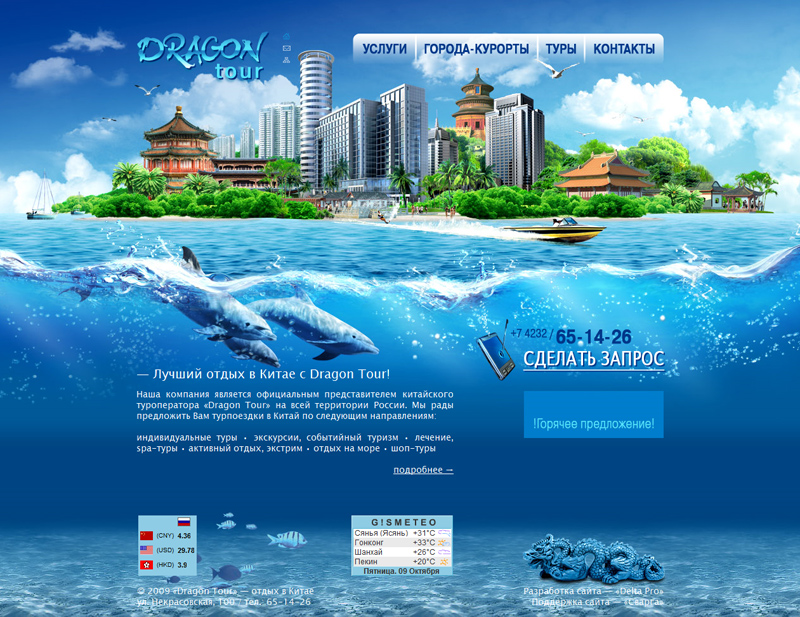 "Dragon-tour" - компания из Владивостока, которая специализируется на турах в Китай. Сайт призван вдохновить посетителей красотами Китая и сподвигнуть на путешествие туда. Да и сам сайт благодаря таланту дизайнера Ханны Томиловой получился такой, что быть на нём - это уже путешествие..