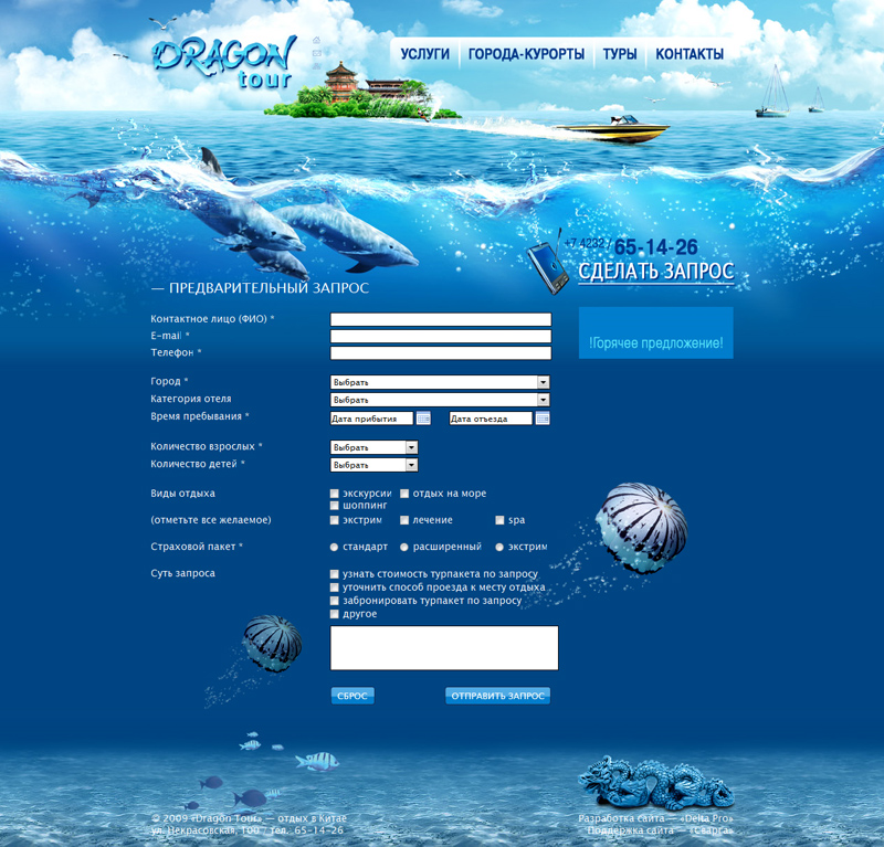 Задача сайта: представительство компании в сети, привлечение новых клиентов, прием заявок на путешествия, создание имиджа компании.