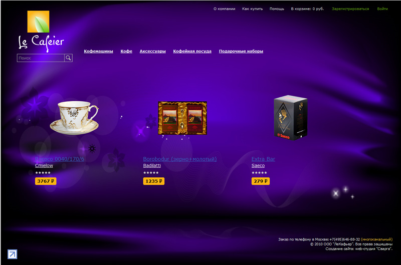 - каталог товаров, разделенный на 5 подкаталогов (кофемашины, кофе, аксессуары, кофейная посуда и подарочные наборы), причем каждый раздел имеет свою, легко изменяемую через админку, цветовую гамму;