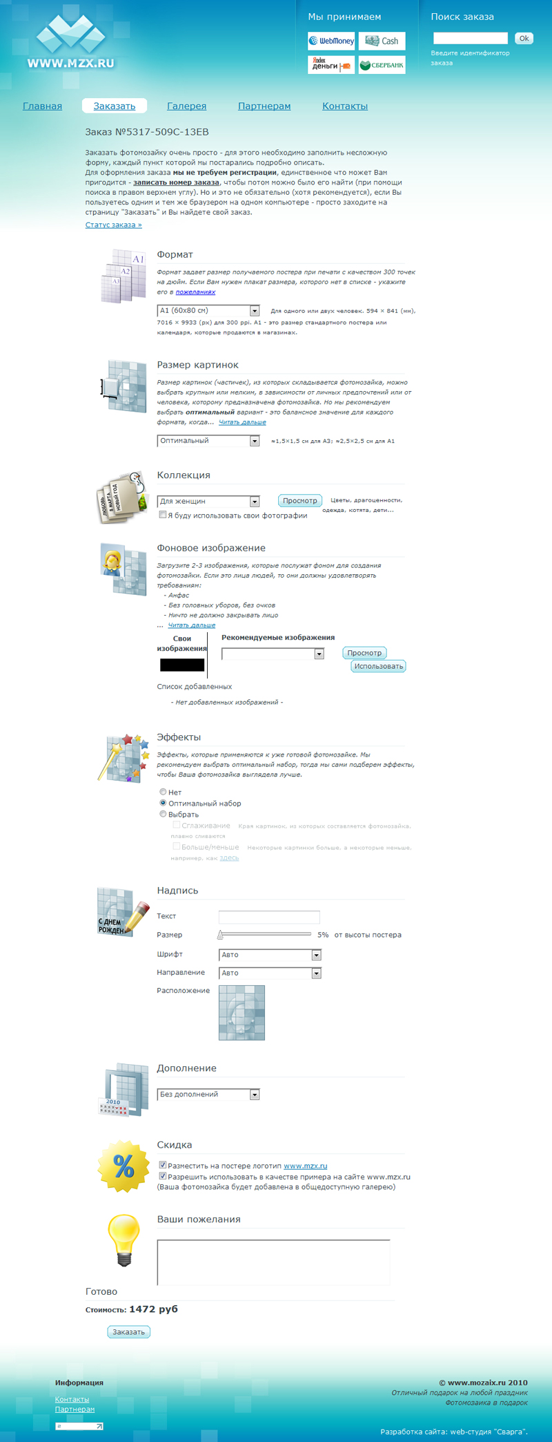 - для добавления изображений к заказу использован флеш-загрузчик, позволяющий отправлять на сайт сразу несколько файлов или папок;