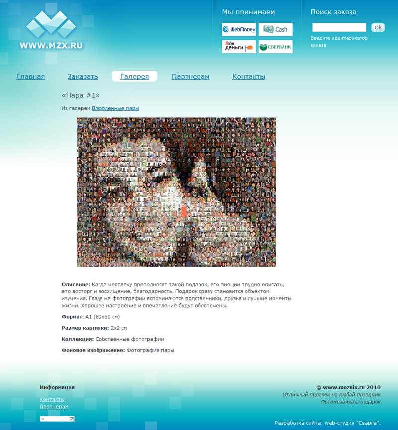 - на главной странице размещена флеш-карусель для демонстрации лучших примеров фотомозаек;