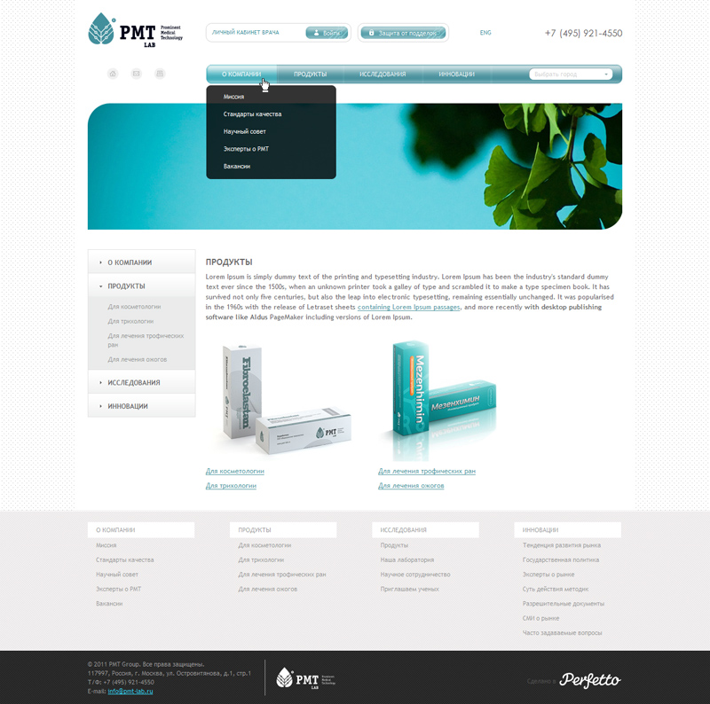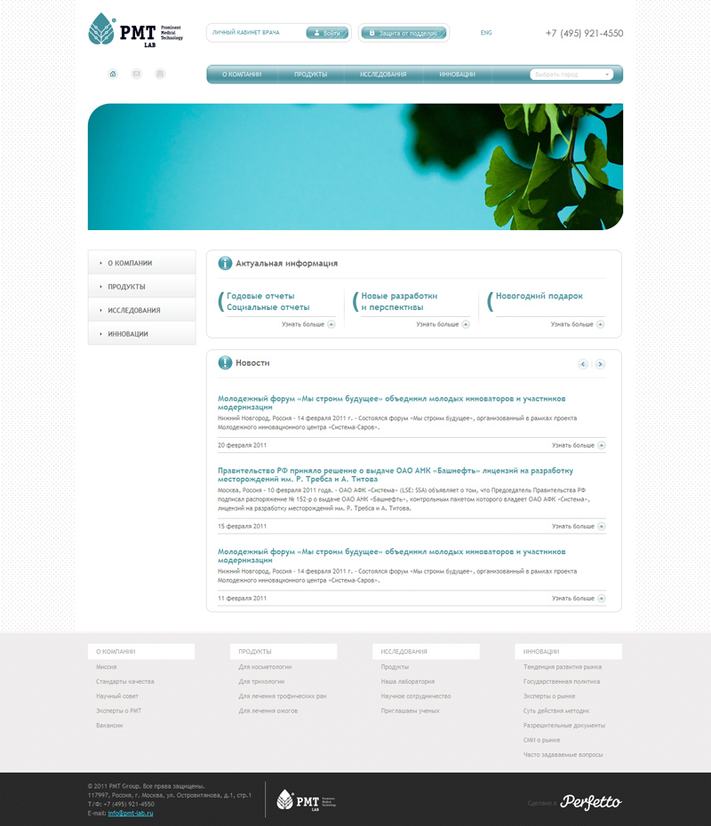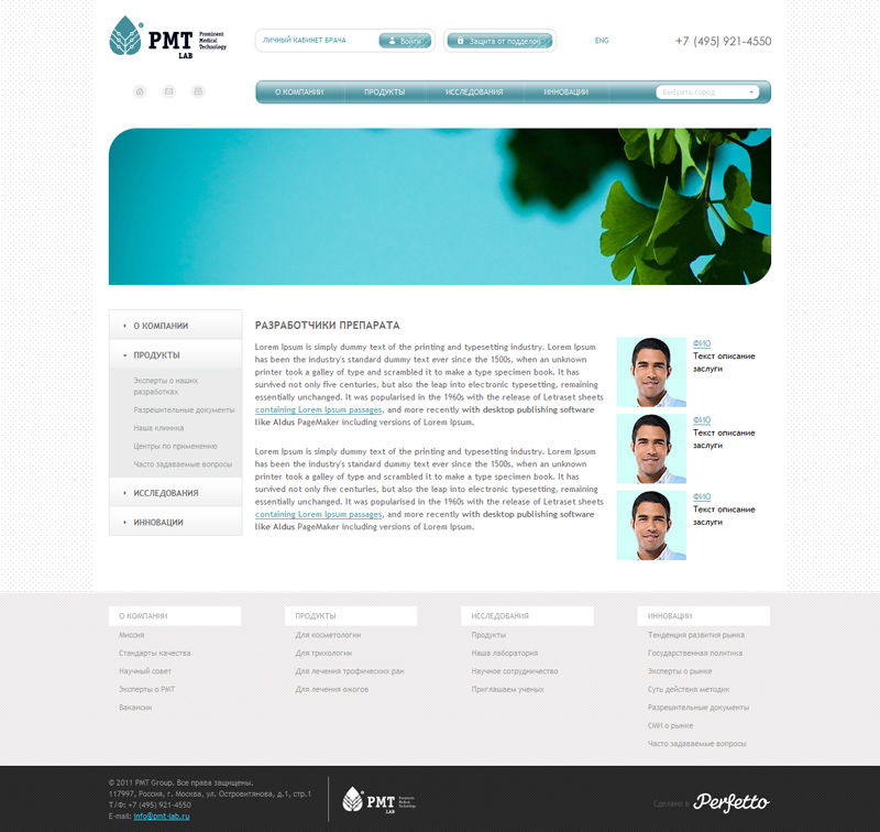 PMT Group - московская лаборатория, производящая инновационные продукты для косметологии, трихологии и других областей медицины. На сайте разместится информация о компании, о ее продукции и разработчиках препаратов, а также статьи и исследования лаборатории.