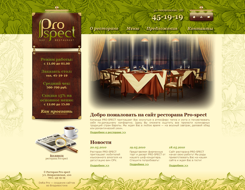 Pro-Spect (г.Владивосток) - это потрясающие ресторан европейской кухни. Уютный зал на 40 персон идеален как для деловых обедов, так и для семейных ужинов, банкетов и корпоративных торжеств.