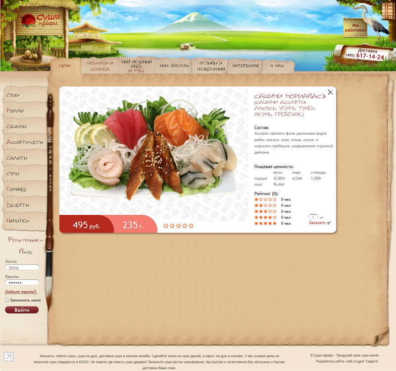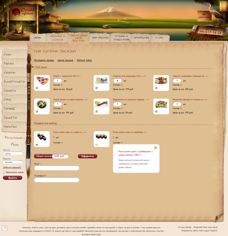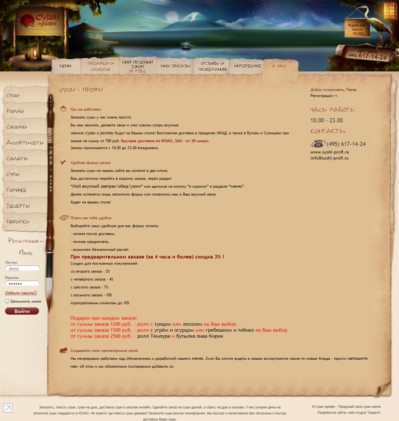 - по желанию клиента в дизайне используется пергамент и японский шрифт (был подключен специальный скрипт, чтобы этот шрифт корректно отображался без использования картинок во всех браузерах);