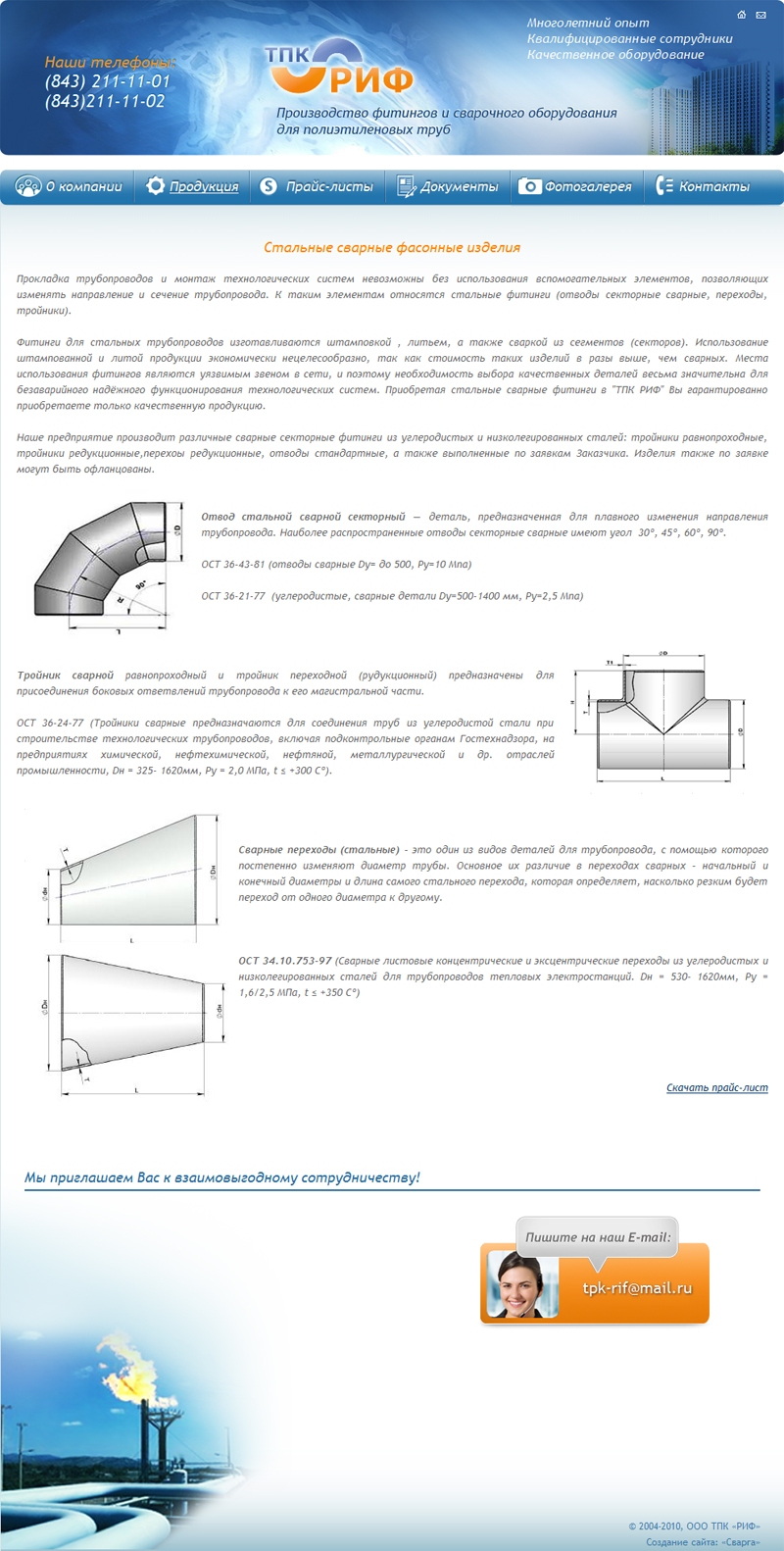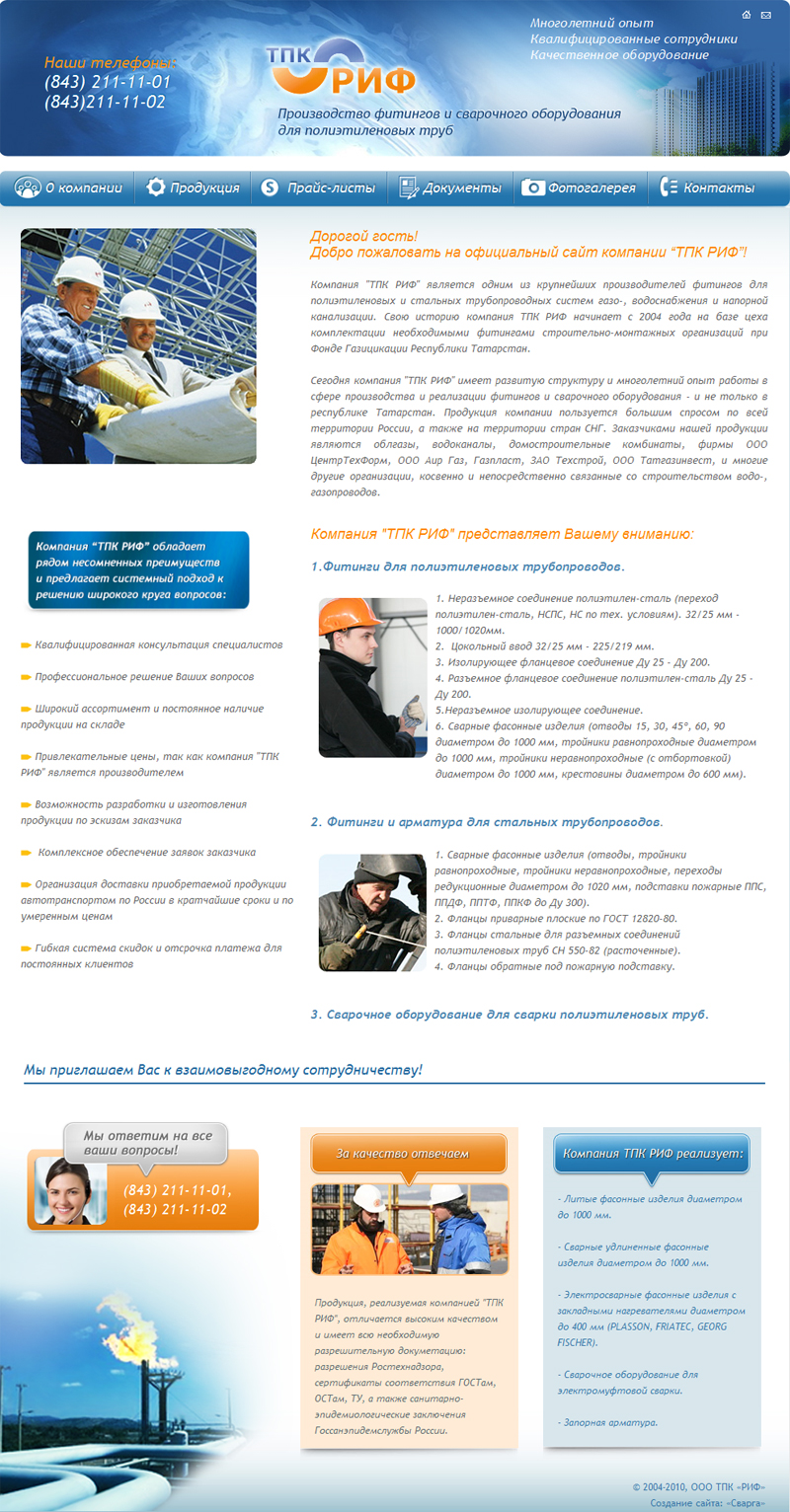 Компания "ТПК РИФ" является одним из крупнейших производителей фитингов для полиэтиленовых и стальных трубопроводных систем газо-, водоснабжения и напорной канализации. Продукция компании пользуется большим спросом по всей территории России, а также на территории стран СНГ.