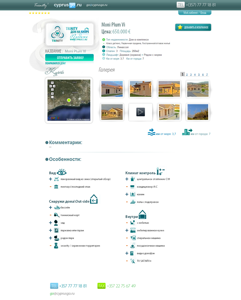 6. На странице объекта недвижимости размещается вся доступная информация о нем, а также галерея медиа-файлов. Для просмотра галереи использован модуль Shadowbox, под который был сверстан оригинальный скин.